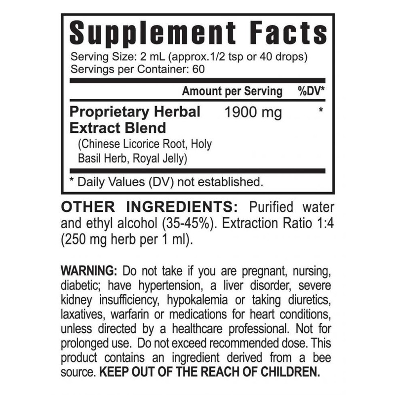 Formula: HOLY BASIL, CHINESE LICORICE, ROYAL JELLY.