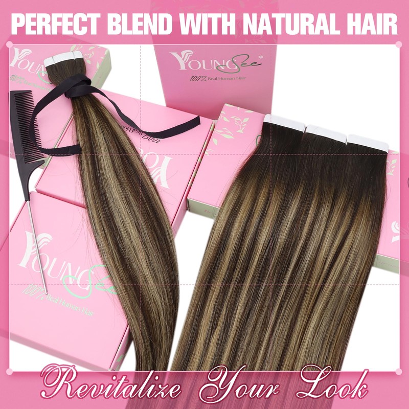 YoungSee Tape Hair Extensions Balayage Tape Extensions Real Human Hair 18In Dark Brown Ombre Blonde with Brown Balayage Invisible Tape in Hair Extensions Human Hair for Women Ombre Hair 20pcs 50g