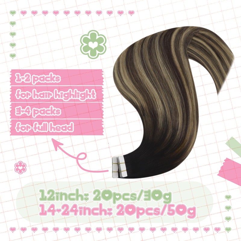 - 【Specifications】YoungSee dark brown ombre tape in hair extensions is 1.5g/pc for 12inch, 20pcs/30g per pack; 2.5g/pc for 14-24inch, 20pcs/50g per pack. 1-2 packs for adding volume, 3-4 packs for full head.