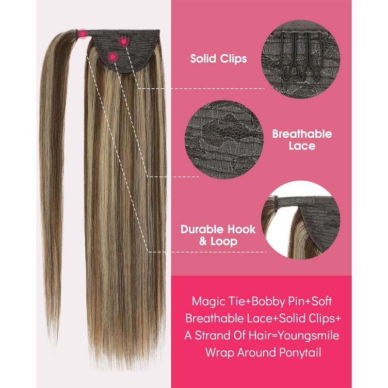 Youngsmile Ponytail Extension, Wrap Around Clip in Handmade Real Human Hair, Pony Tail Hair Extensions Hairpieces,80g 14inch,#4P27 Chocolate Brown Highlighted with Caramel Blonde (PT#4P27-14Inch)