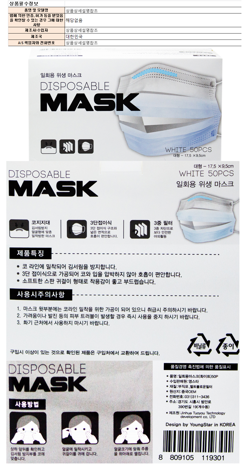 Youngstar 3-Layer Disposable Mask 50 Count - Large (White) 7ea