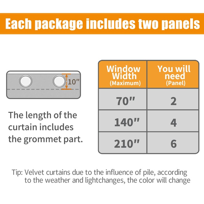 - Package: The package includes set of 2 elegant velvet curtain panels. Each luxury curtain measure 52 inch wide and 84 inch length. Each window drapes has 8 silver metal grommets with 1.6-inch inner diameter, fit well with most rods. Easy to hang, and slide smoothly.