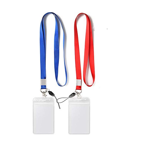 YOUOWO 2 Pack ID Badge Holder with Blue Red Lanyard Strap Neck Strings Lanyard with Vertical Name Tag Card Holders Punched Zipper Waterproof Resealable Clear Plastic