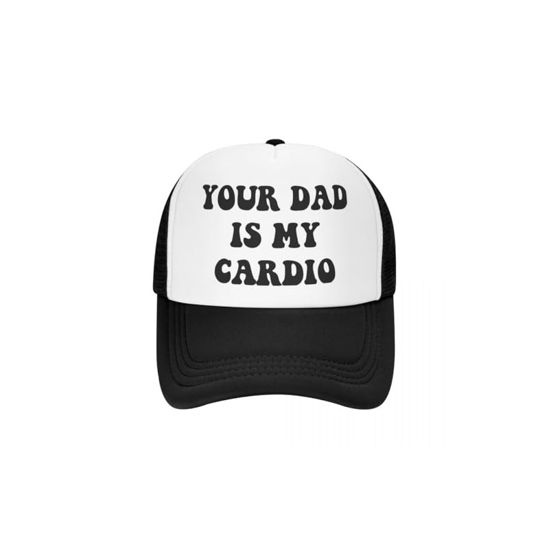 - Funny Trucker Hats For Women Men Kids Trucker Hat Black And White. All Over Your Dad Is My Cardio- Your Dad Is My Cardio Printed All Over The Hat. Really Catches Eyes. You Will Receive Tons Of Compliments From Your Friends And Passby Even Whenever You Wear It