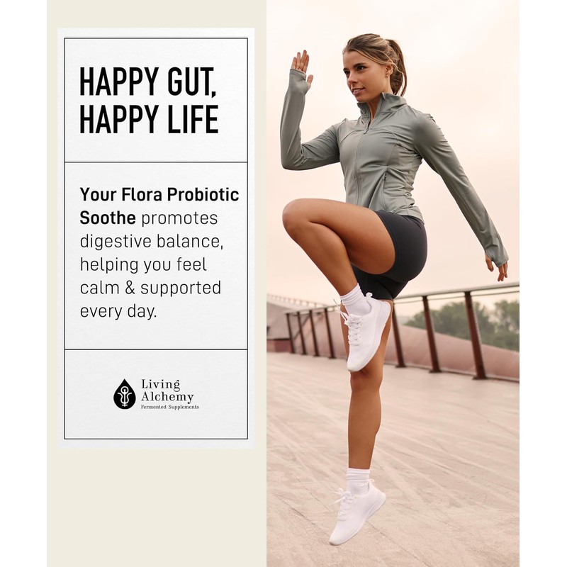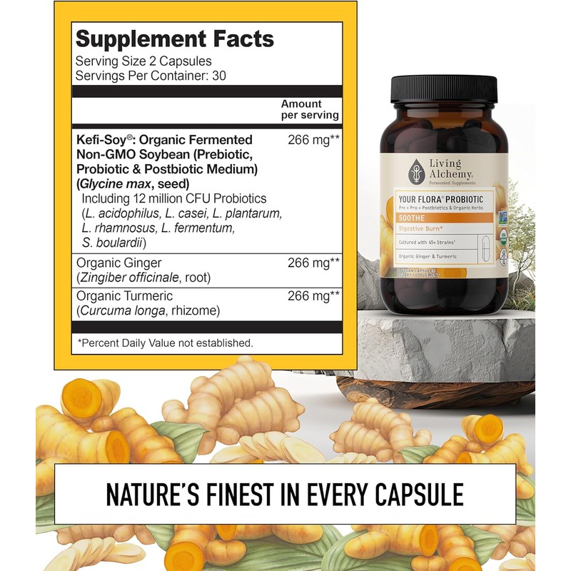 Your Flora Probiotic Soothe – Non-GMO Probiotics with Fermented Soybean, Ginger, & Turmeric for Gut Balance, Digestion, & Support – Prebiotics, Postbiotics, Digestive Enzymes – Living Alchemy, 60 Pcs