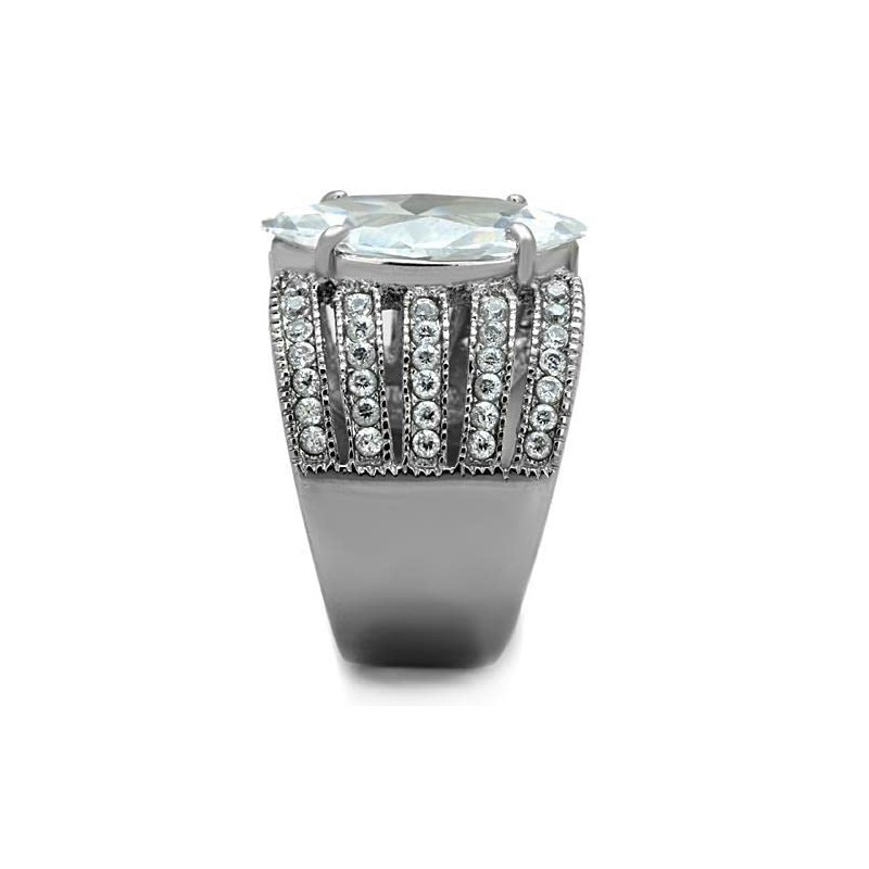 - A showstopper,18,9mm big flawless marquise cut prong set high grade cz ring with accents cz's on each shoulder finished in stainless steel 316l will not tarnish or make your finger green ideal for people with allergies stainless steel 316l no plating no tarnish or green finger top grade gemstones Stainless Steel 316l is what surgeons use with no tarnish, no green finger ideal for allergy wearers wear 24/7 Our steel will last a lifetime. Our Czs are the high Grade Gemstones Not glass or cloudy chips. All Jewellery is made in the USA, Stones are prong set or pave Set by master Jewellers who set real Diamonds. Stamped 316l inside