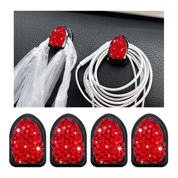 Yourkar 4PCS Bling Car Mini Hooks, Multifunctional Adhesive Small Auto Storage Hook for Key Cable Mask, Crystal Rhinestone Dashboard Hanging Hook, Interior Decor Car Accessories (Red)