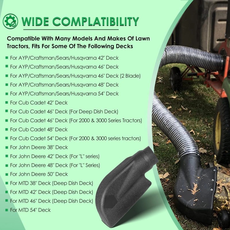 - 【HIGH PERFORMANCE】: The 69861 mower deck adapter is designed to optimize airflow from the mower deck to the vacuum system, minimizing resistance for maximum suction power. This deck boot connector used with leaf vacuums to improve suction efficiency, reduce clogs for a cleaner lawn. The adapter ensures your lawn vacuum smooth operation and optimal vacuum performance.