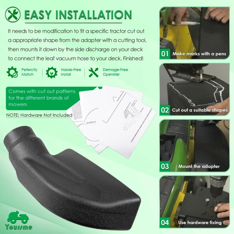 - 【EASY INSTALLATION】: The 69861 adapter mounts down by the side discharge on your deck to connect the leaf vacuum hose to your deck. This chute is plastic, and requires modification to fit a specific tractor. Need to cut out from the plastic where the chute attaches to the deck to make it fit your mower. NOTE that the hardware necessary to attach the deck adapter to the mower is not included.