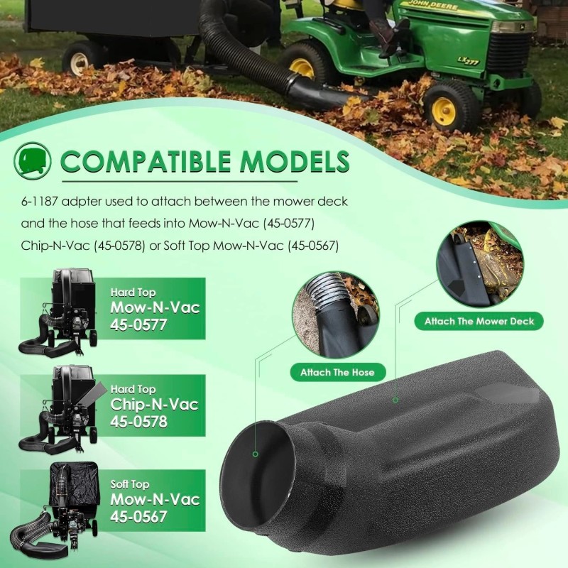 - 【WIDE COMPATIBILITY】: 69861 Mow-N-Vac adapter is compatible with a variety of Mow-N-Vac mower models, including 43830, 6-1187, 45-0577, 45-0578, 45-0567. The adapter is designed to attach between the mower deck and the hose to keep vacuum system efficiency operation. Ideal for users who want to easily maintain a clean lawn, the deck chute will enhance your lawn care routine.