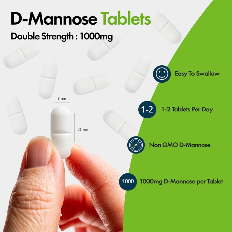 - CONVENIENT SOURCE OF D-MANNOSE - D-Mannose is a naturally occurring sugar found in many fruits, including cranberries. Our high strength tablets are tested to contain a minimum of 1000mg of D-Mannose each.