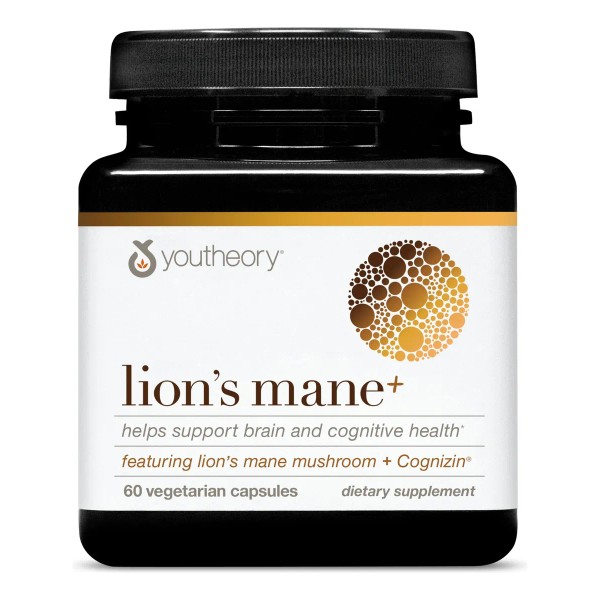 Suplemento Lion’s Mane Plus de Youtheory, 60 cápsulas diseñadas para apoyar la salud cerebral, la memoria y la concentración de manera natural.