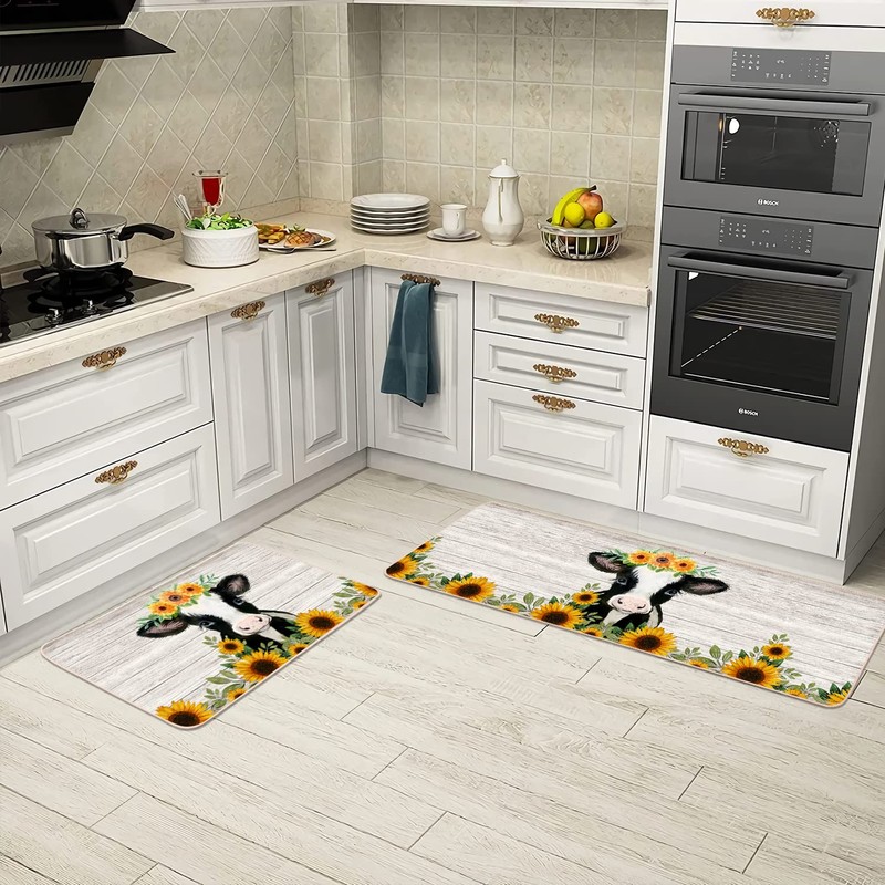YOUWOUS Sunflower Cow Farmhouse Kitchen Mats Set of 2-17x29 and 17x47 Inch, Decorative Non Slip Backing Floor Rugs for Home Kitchen