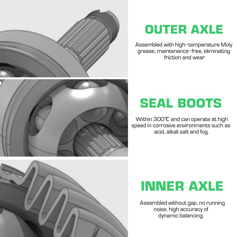 - 【WIDELY USED】: CV Axle can cope with harsh environment. The temperature is within 300℃, and it can work in corrosive environments such as acid, alkali and salt spray. with superior strength and longevity.