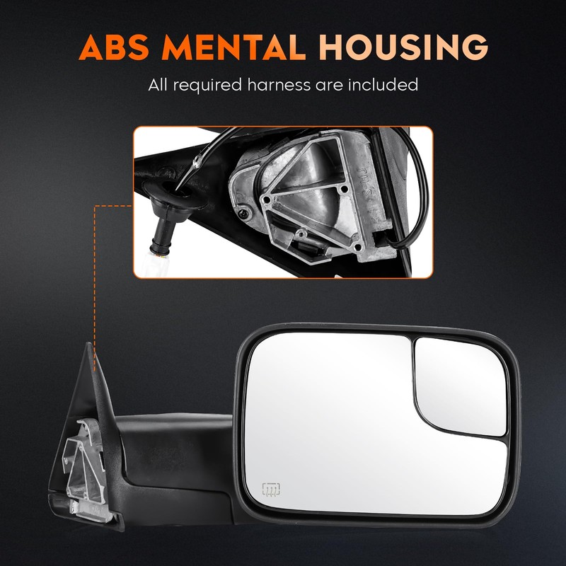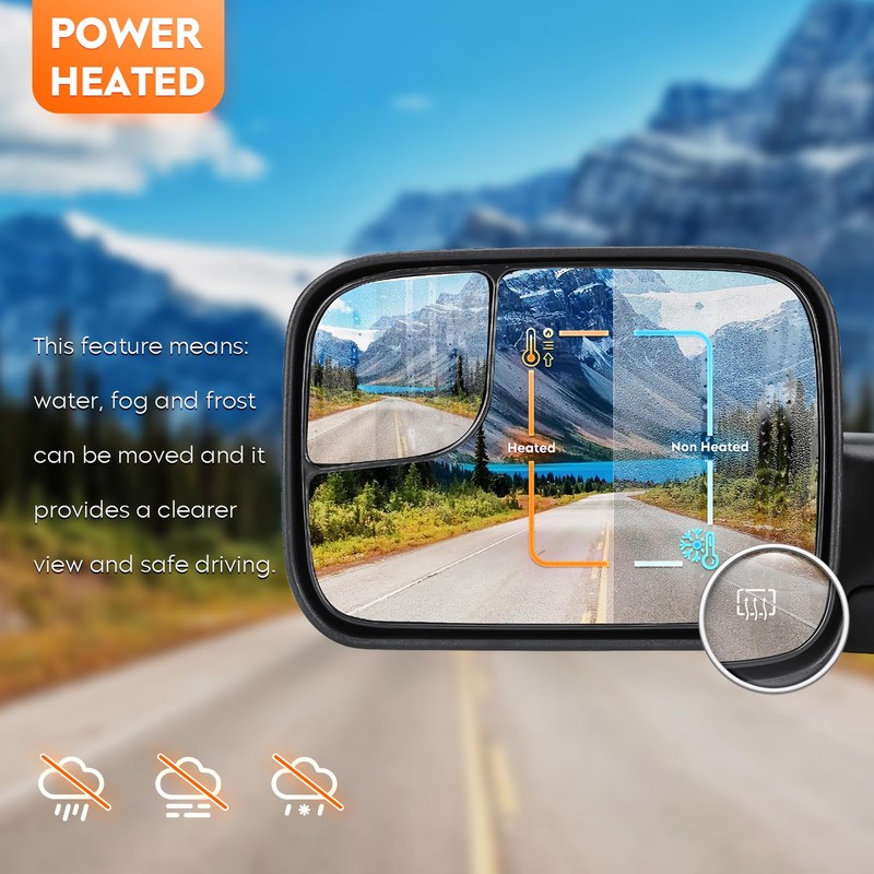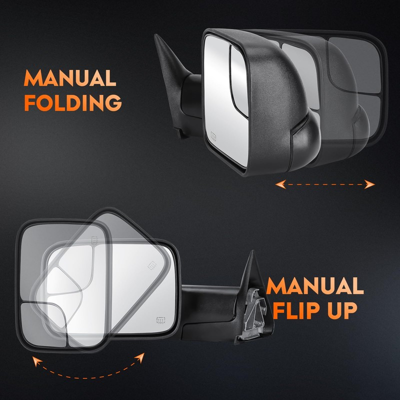- 【FUNCTIONS OF TOW MIRRORS】:Motorized adjustable flat mirror; Manual folding; Manual Flip Up; Heated