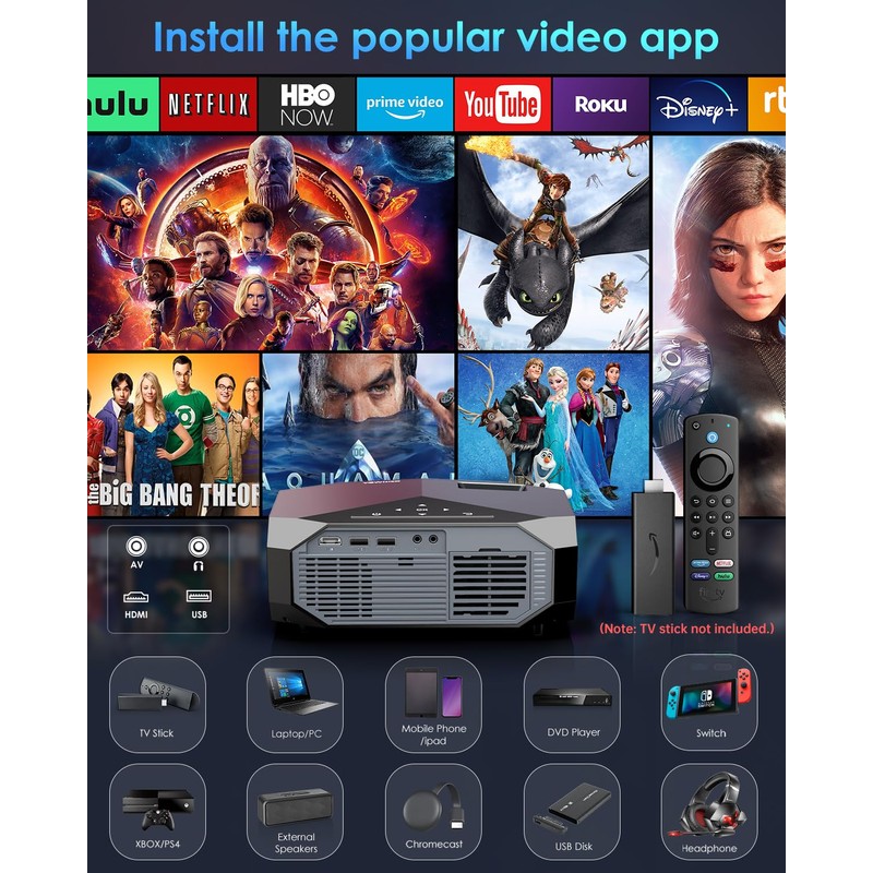 - 【Extensive Device Connection】YOWHICK projector with wifi and bluetooth supports WiFi 6 or 2.4G Dual-Band WiFi connection. The movie projector with the built-in HDMI, USB, AV, TF and 3.5mm headphone port; compatible with iPhone, Android, Win systems; it can easily connect your TV stick, phone, laptop, USB stick, PS5 etc,. (Due to copyright issues, You can use an HDMI cable connected to Laptop to work with screen mirroring with Netflix, Hulu, Amazon Prime etc.)