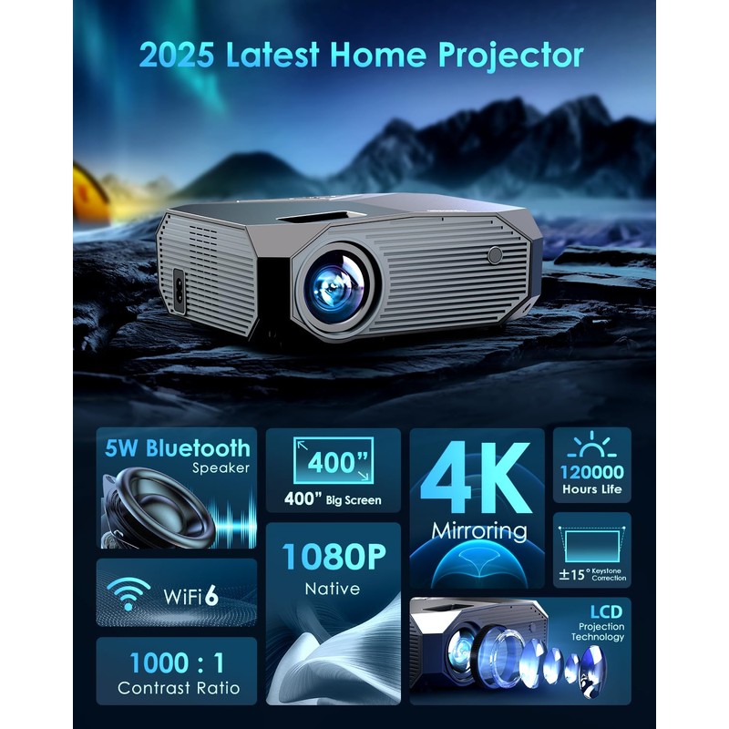 - 【User Friendly Design & Reliable Service】The bluetooth and wifi projector support desktop placement, tripod and ceiling installation projection. You can fall asleep without thinking since our projector can automatically turn off after a fixed time you set. 2 years warranty and professional technical lifetime customer service makes you worry about the fee to purchase.