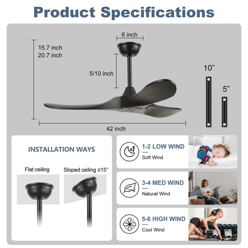 - Easy to Install:Most of the functional components of this wood black ceiling fans are already assembled, it can be easily installed by yourself follow the detailed manual instruction. At the same time,the parcel comes with 2 different lengths down rods(5''/10'') for your low and high ceilings. If there are any issues with the installation, please feel free to contact our customer service, and we will offer you one-to-one guidance service within 12 hours.