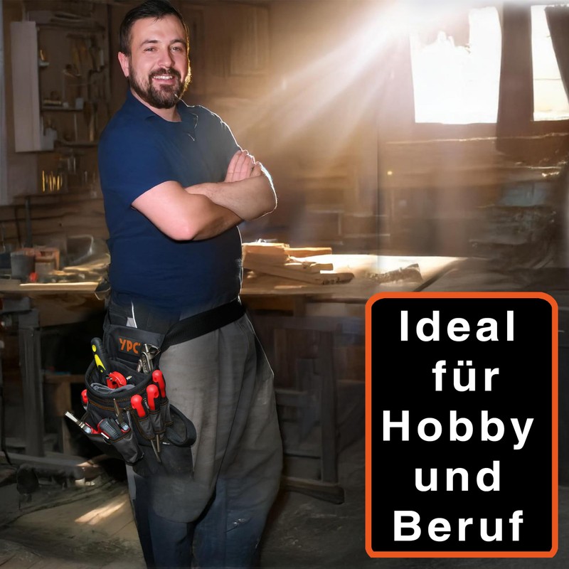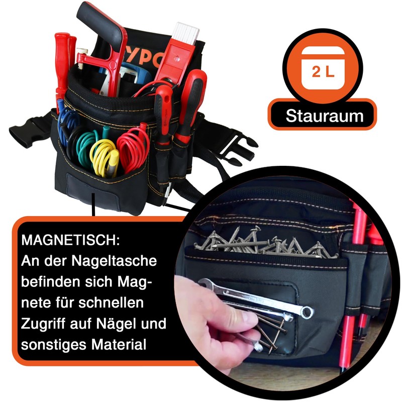 - Organisation: The large inner pocket of the tool belt is divided into four compartments and offers plenty of space for measuring devices, mobile phone and other aids. The belt holder is made of tear-resistant nylon