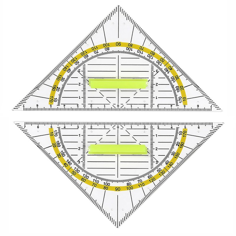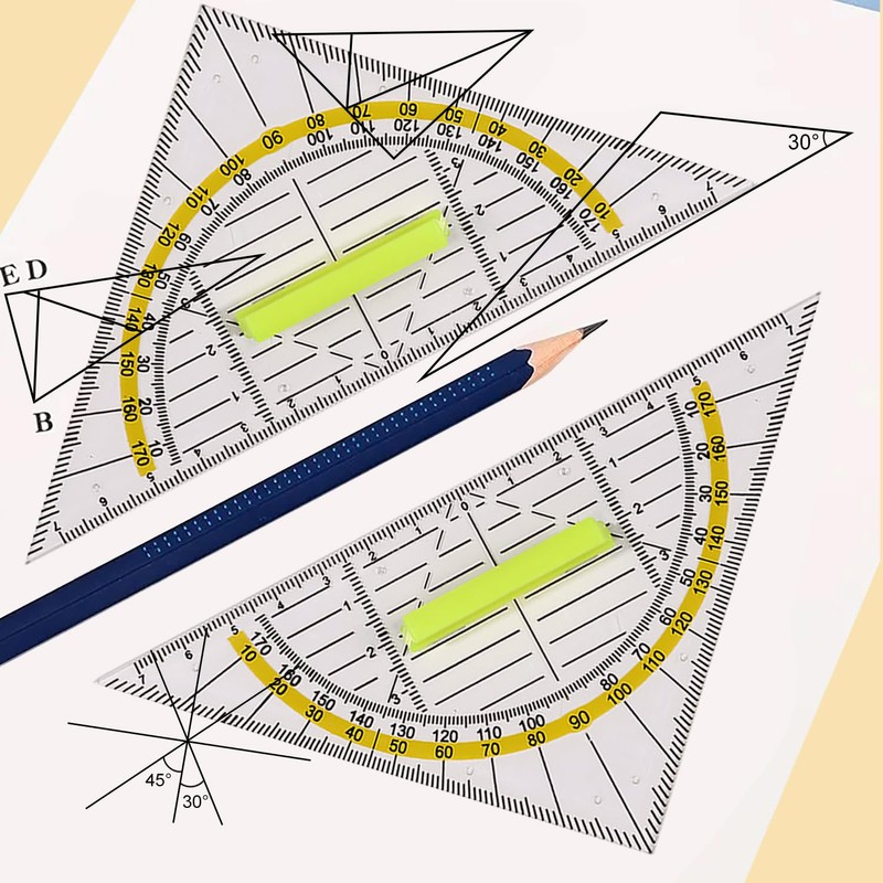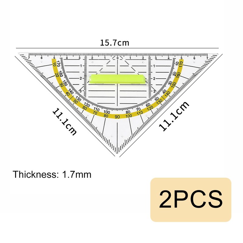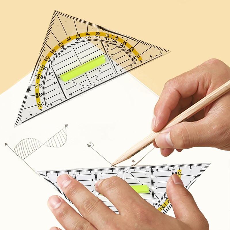 Dieses transparente, multifunktionale Dreieckslineal (Geodreieck) ist ein praktisches Messwerkzeug, das entwickelt wurde, um Ihre Bedürfnisse beim Zeichnen, Messen und Kartieren zu erfüllen. Es vereint die Funktionen eines Lineals, eines Winkelmessers, einer symmetrischen Skala und eines Kompasses in einem einzigen Werkzeug, um Ihnen ein umfassendes Set an Messwerkzeugen zur Verfügung zu stellen.