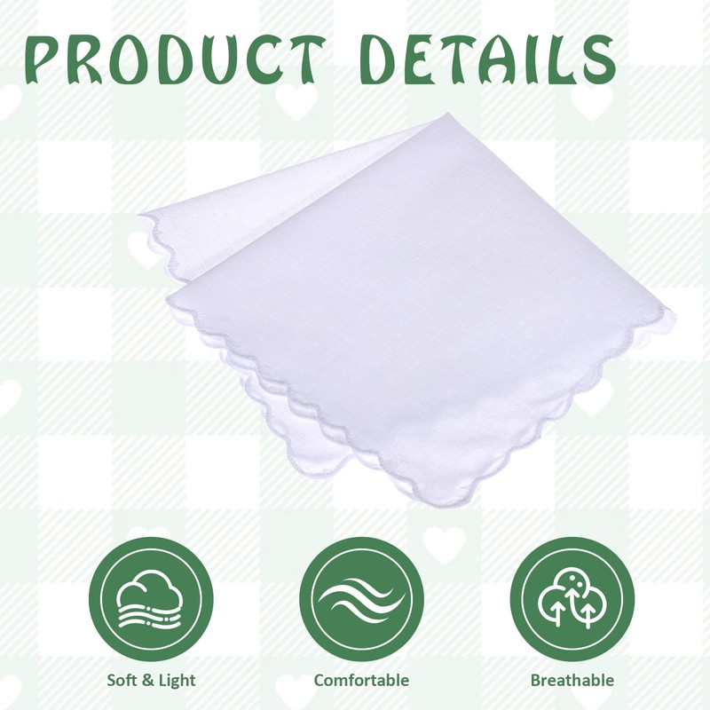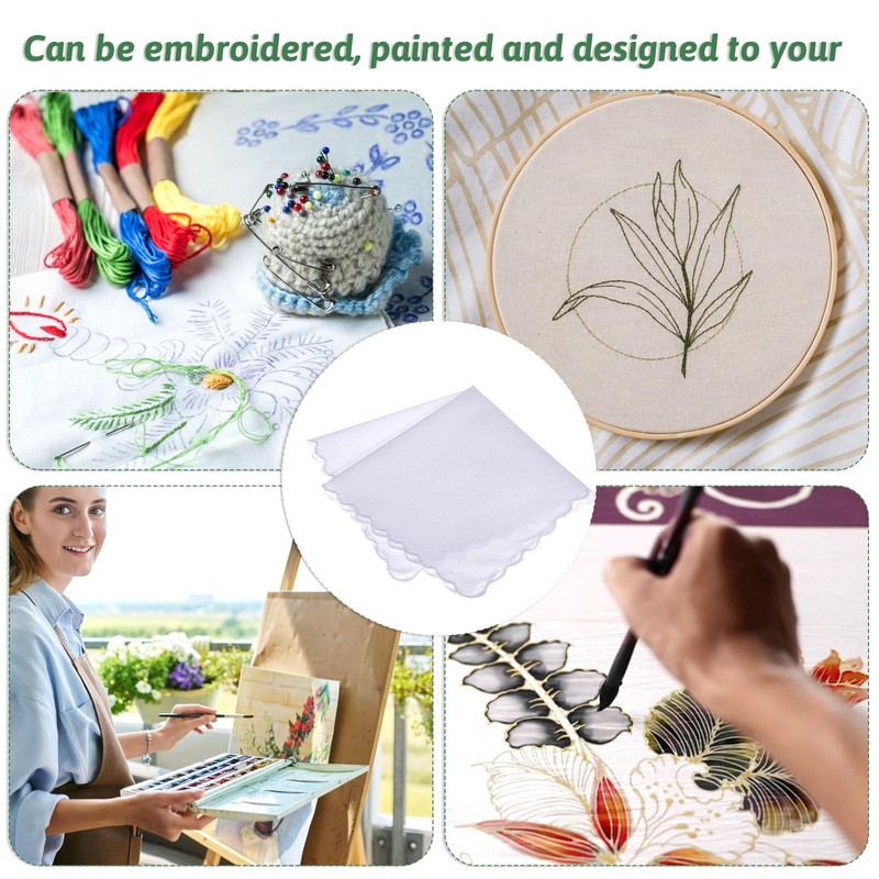 - 【Creative DIY】: Our women's handkerchiefs are great for creative uses. You can embroider, paint, tie dye or use them as table mats for little girls tea parties. The cute embroidered scalloped edges are exquisite and chic. Use your imagination to make the handkerchief more beautiful