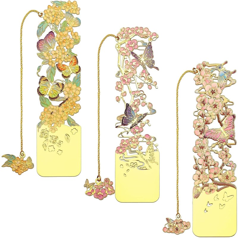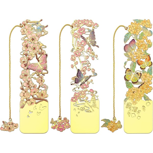 - ELEGANT DESIGN: Set of 3 metal bookmarks featuring delicate floral patterns with butterflies in gold-tone finish - includes osmanthus, plum blossom, and apricot designs