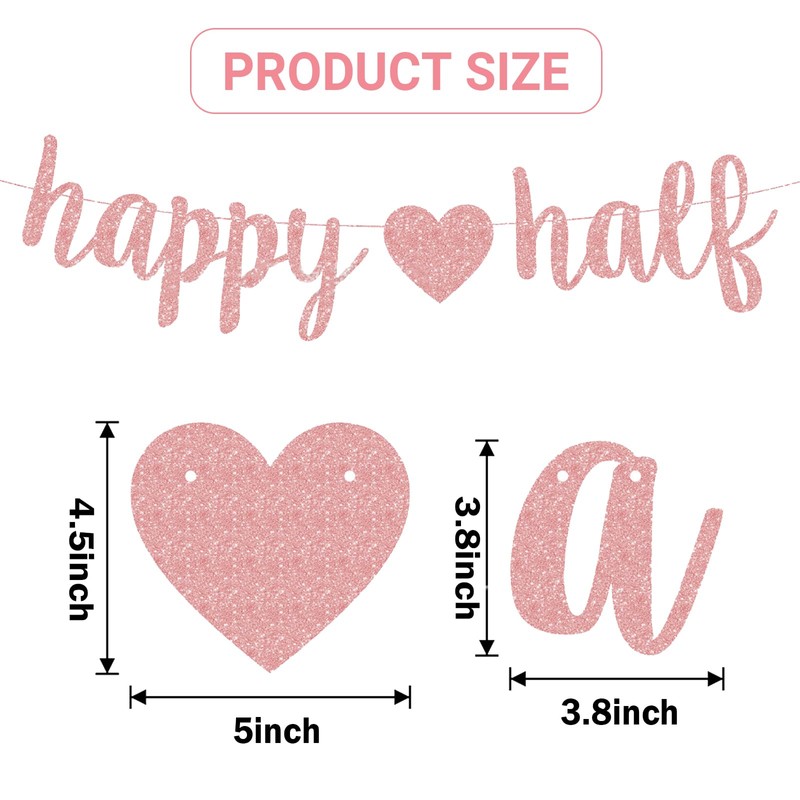 - Happy Half Banner Material: Made of super flash cardboard, very strong. Happy 6 Months Banner is perfect for your boy or girl party. Baby shower 1/2 year old birthday party decoration package includes 9pcs of rose gold letters and 1pc of heart figure. Happy half rose gold flag, total weight of about 30g and total length of baby shower 1/2 year old birthday party supplies banner is approx 3 meters. The happy half birthday banner length is adjustable, you can adjust the distance based on the letters space
