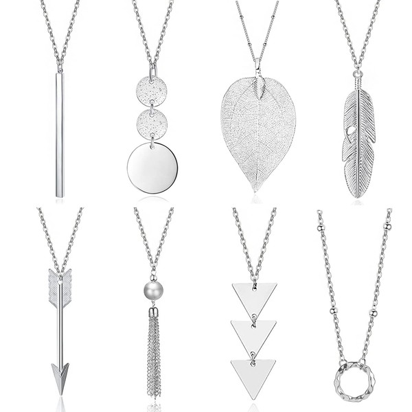 - Long Necklace Set: 8 Pcs long necklace set, 8 different styles of simple necklaces in silver, including bar necklace, feather necklace, circle necklace, leaf necklace, etc. Wear them will show your personal charm, elegant, beautiful and attractive, perfect for everyday wearing.