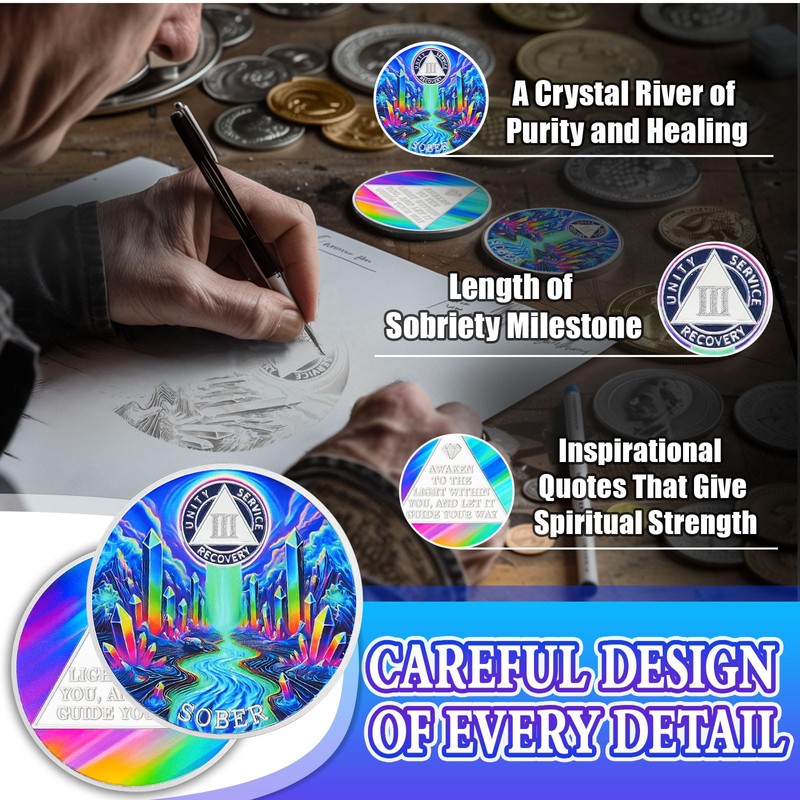 - Recovery Brings Healing and Transformation: This Crystal 3 Year Sobriety Coin features an engraved AA triangle with Roman numerals on the obverse, a celebration and commemoration of a sobriety milestone. The vibrant landscape of crystal clusters and rivers illustrates the journey of personal transformation and symbolizes the purity and radiance of sobriety. This brightly colored AA coin embodies the spiritual flow and healing of the sobriety process and is a perfect reminder of inner strength
