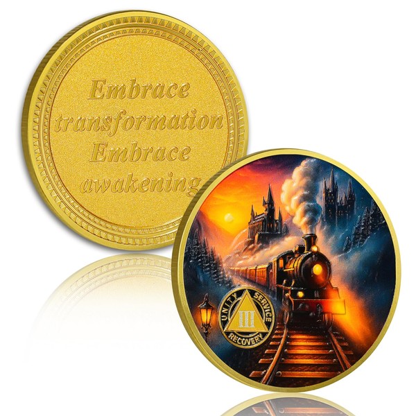 - Celebrate Your Journey Toward Transformation: Embark on a new path with the Steam Train 3 Year Sobriety Coin. This train AA coin has a very original design, with a steam train pulling out of the mist and hurtling towards the light, symbolising the journey from confusion to clarity. Each AA medallion is engraved with a corresponding sobriety coin milestone number, which not only commemorates your sobriety achievement, this AA recovery coin also serves as a powerful symbol of direction and purpose