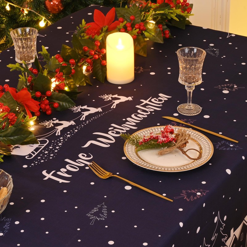 This Christmas tablecloth is the perfect blue and white with a cartoon Christmas tree, a house, a snowflake and an elk pattern and with "F raw W eihachten" in the middle of the tablecloth, it is the perfect Christmas table decoration that will surely give you a vibrant and fun atmosphere in winter atmosphere
