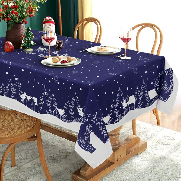 Yrendenge Christmas Tablecloth Blue White Tablecloth Washable Outdoor Tablecloth Rectangular Waterproof Cartoon Houses Tree Elk Tablecloth for Winter Holidays Home Decor 140 x 240 cm