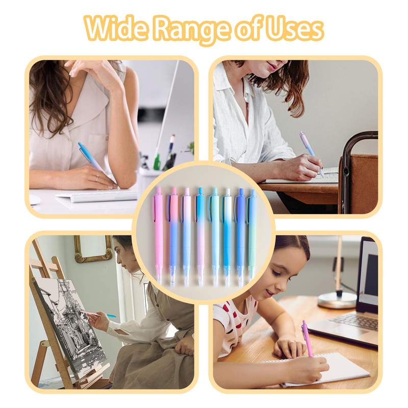 - 【Rich Packaging】You will receive 8 retractable fountain pens with gradient design and 20 erasable ink capsules, 20 ink capsules contain 10 black ink, 10 blue ink. Each fountain pen comes with a cap to prevent the ink from drying out and an eraser at the top of each cap. The unique design combines the advantages of fountain pens and pencils. Plenty of quantity and colors for your daily use and replacement.
