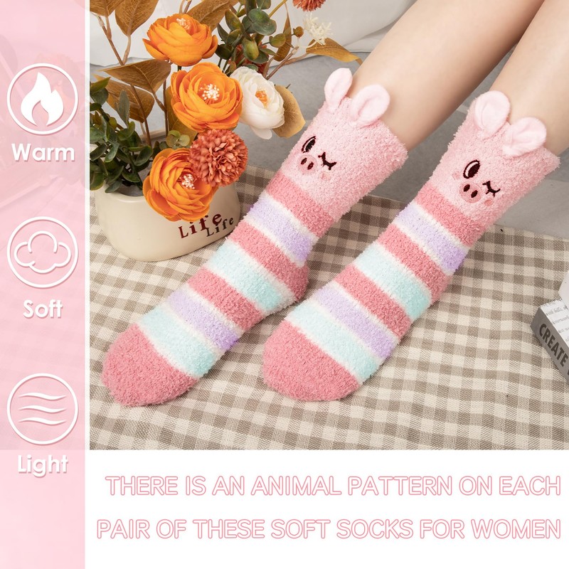 - Multiple Options: The style and quantity of kawaii socks are consistent with the picture; One pack includes 3 different style fuzzy slipper socks; There is an animal pattern on each pair of these soft socks for women, such as cat, dog, pig, lion and so on