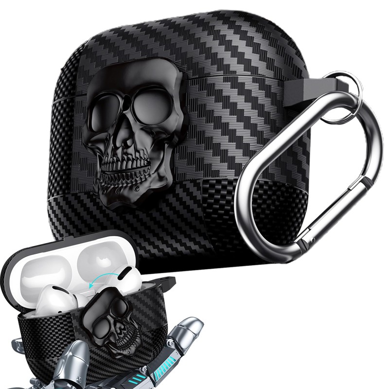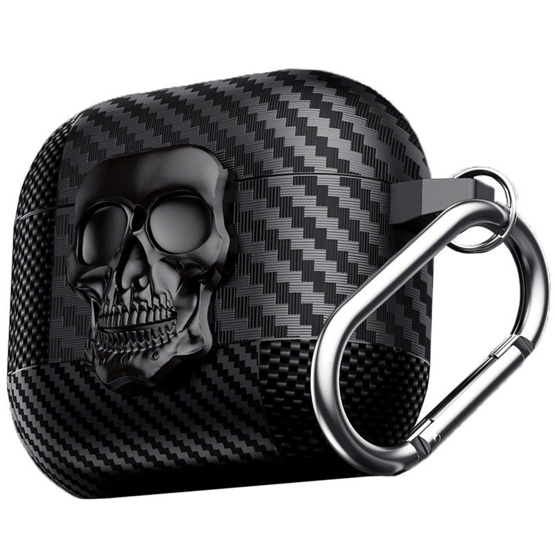 YSNZAQ Skull Design Case for AirPods 4, Cool Carbon Fiber Grain Military-Grade Shockproof Earphone Case with Carabiner & Secure Lock Clip for AirPods 4th Generation KLT Black