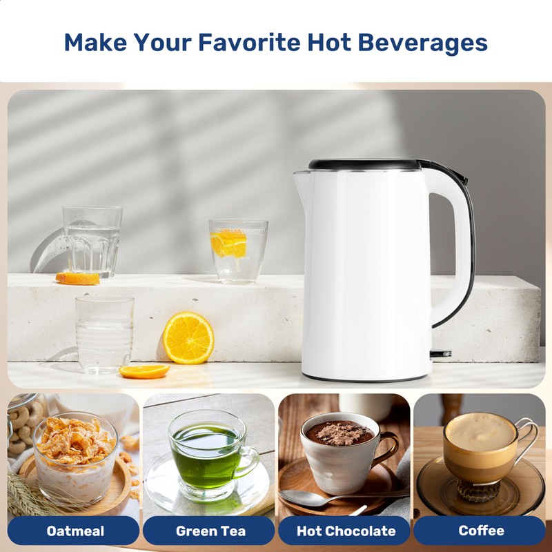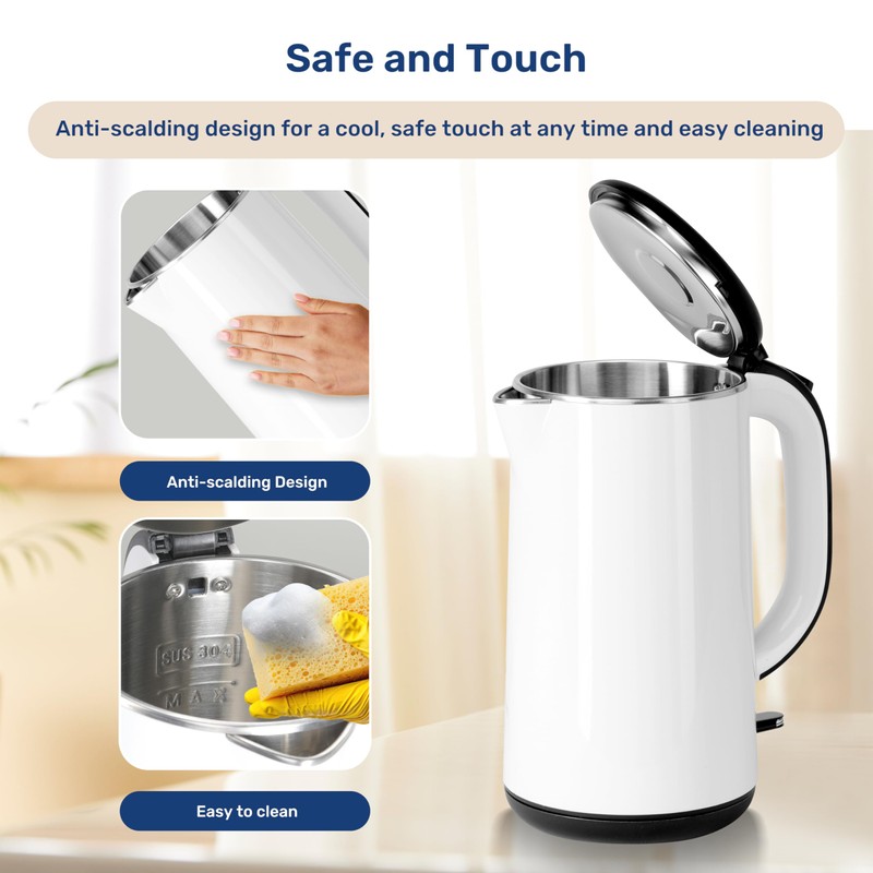 YSSOA Electric Kettle, 1.8L Double Wall, 304 Stainless Steel Interior, BPA-Free, 1100W Fast Boiling, Auto Shut-Off & Boil Dry Protection, Quiet Boil, Cordless Base & LED Indicator, White