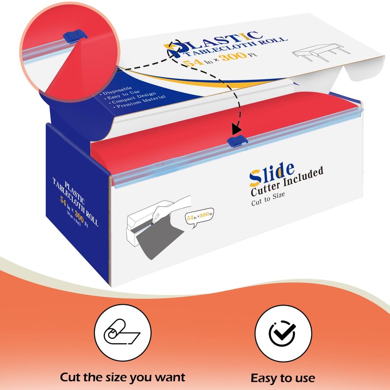 - Cut Out to Fit the Table: Use the slide cutter that comes with the box to cut out the plastic table cloth to various sizes you want for your table. 300 feet is plenty for any large party.
