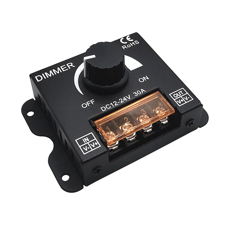 - FLEXIBLE USE - Suitable for DC 12V-24V MAX 30A LED lighting applications, single channel dimmer controller for single color 5050 3528 5630 LED strip lights. When connecting the LED lights and power supply, please pay attention to the correct position of positive and negative poles, otherwise it will affect the regulation function or the light strip will not be bright.
