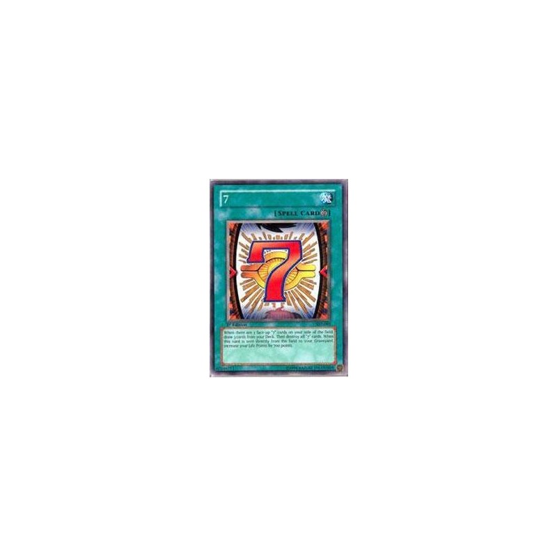 Card Text: When there are 3 face-up '7' cards on your side of the field, draw 3 cards from your Deck. Then destroy all '7' cards. When this card is sent directly from the field to your Graveyard, increase your Life Points by 700 points.