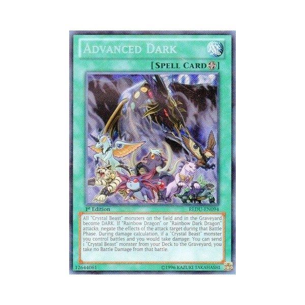 Card Text: All "Crystal Beast" monsters on the field and in the Graveyard become DARK. If "Rainbow Dragon" or "Rainbow Dark Dragon" attacks, negate the effects of the attack target, during that Battle Phase. During damage calculation, if a "Crystal Beast" monster you control battles and you would take damage: You can send 1 "Crystal Beast" monster from your Deck to the Graveyard; you take no Battle Damage from that battle.