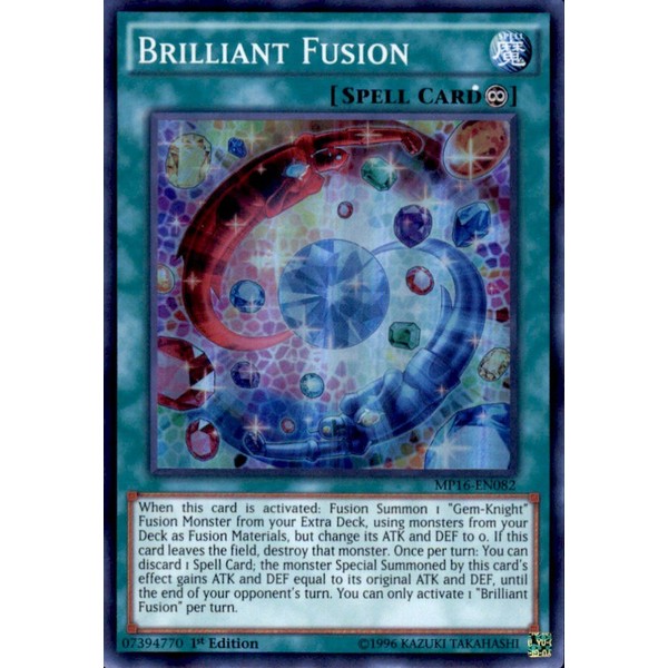 Card Text: When this card is activated: Fusion Summon 1 "Gem-Knight" Fusion Monster from your Extra Deck, using monsters from your Deck as Fusion Materials, but change its ATK and DEF to 0. If this card leaves the field, destroy that monster. Once per turn: You can discard 1 Spell Card; the monster Special Summoned by this card's effect gains ATK and DEF equal to its original ATK and DEF, until the end of your opponent's turn. You can only activate 1 "Brilliant Fusion" per turn.