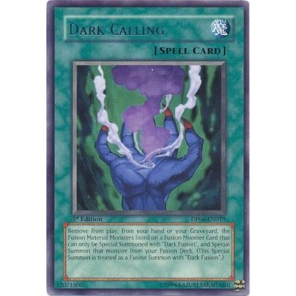 Card Text: Remove from play, from your hand or your Graveyard, the Fusion Material Monsters listed on a Fusion Monster Card that can only be Special Summoned with 'Dark Fusion', and Special Summon that monster from your Fusion Deck. (This Special Summon is treated as a Fusion Summon with 'Dark Fusion'.)