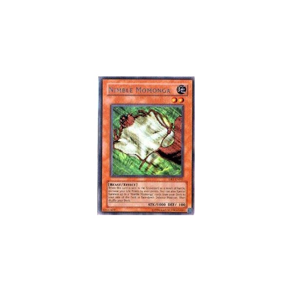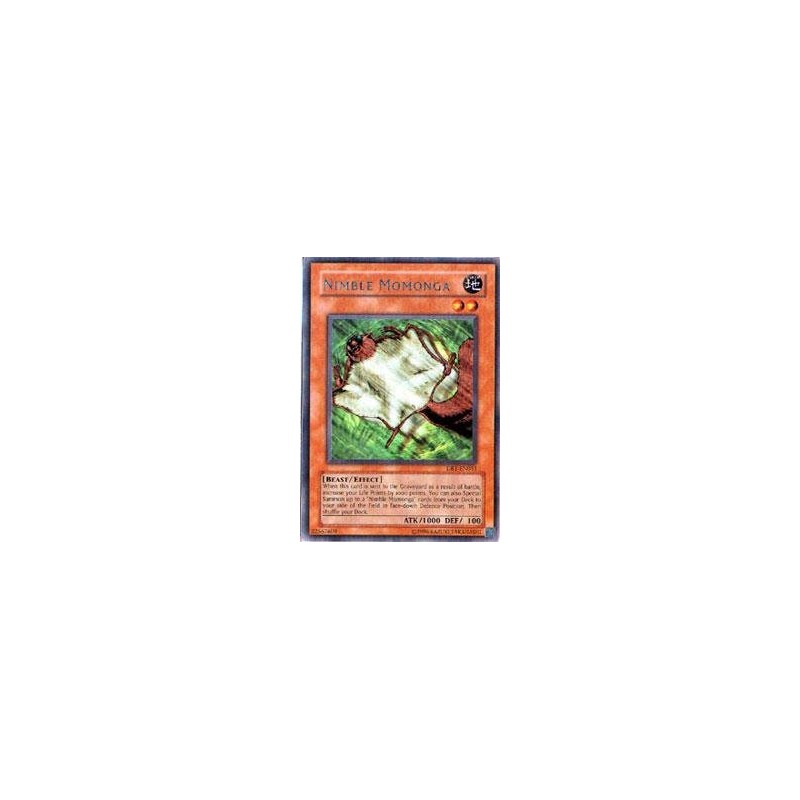 Card Text: When this card is sent to the Graveyard as a result of battle, increase your Life Points by 1000 points. You can also Special Summon up to 2 'Nimble Momonga' cards from your Deck to your side of the field in face-down Defense Position. Then shuffle your Deck.