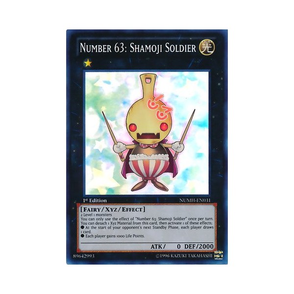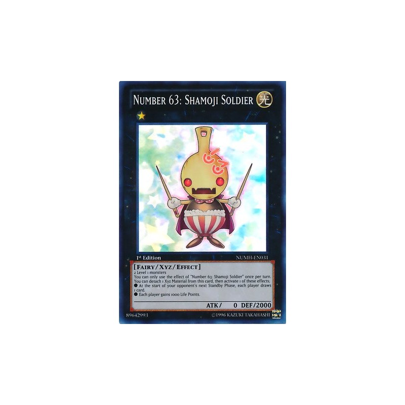 Card Text: 2 Level 1 monstersYou can only use the effect of "Number 63: Shamoji Soldier" once per turn. You can detach 1 Xyz Material from this card, then activate 1 of these effects;* At the start of your opponent's next Standby Phase, each player draws 1 card.* Each player gains 1000 Life Points.
