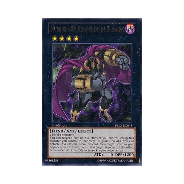 Card Text: 2 Level 4 monstersYou can target 1 face-up Xyz Monster you control; equip this monster you control to that target. It gains 1200 ATK. You can detach 1 Xyz Material from this card then target 1 card in your opponent's Graveyard; banish that target. You can use this effect of "Number 80: Rhapsody in Berserk" up to twice per turn.