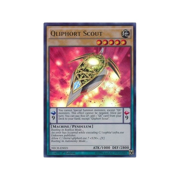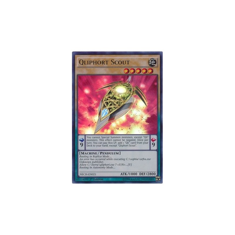 Card Text: Pendulum Effect You cannot Special Summon monsters, except "Qli" monsters. This effect cannot be negated. Once per turn: You can pay 800 LP; add 1 "Qli" card from your Deck to your hand, except "Qliphort Scout". Monster Effect Booting in Replica Mode An error has occurred when executing C:\sophia\zefra.exe Unknown publisher. Allow C:\tierra\qliphort.exe ? [Y] Booting in Autonomy Mode
