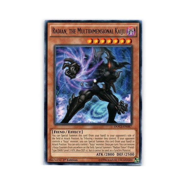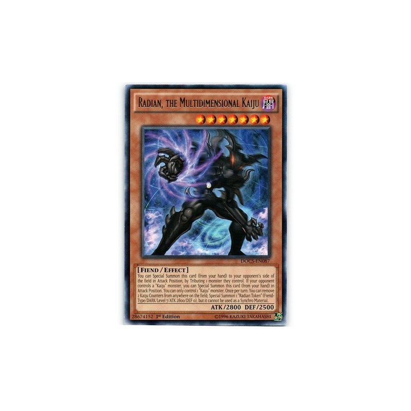 Card Text: You can Special Summon this card (from your hand) to your opponent's side of the field in Attack Position, by Tributing 1 monster they control. If your opponent controls a "Kaiju" monster, you can Special Summon this card (from your hand) in Attack Position. You can only control 1 "Kaiju" monster. Once per turn: You can remove 2 Kaiju Counters from anywhere on the field; Special Summon 1 "Radian Token" (Fiend-Type/DARK/Level 7/ATK 2800/DEF 0), but it cannot be used as a Synchro Material.