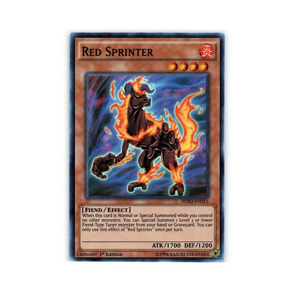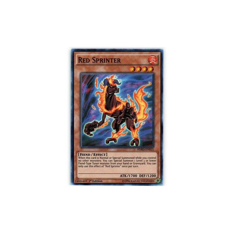 Card Text: When this card is Normal or Special Summoned while you control no other monsters: You can Special Summon 1 Level 3 or lower Fiend-Type Tuner monster from your hand or Graveyard. You can only use this effect of "Red Sprinter" once per turn.