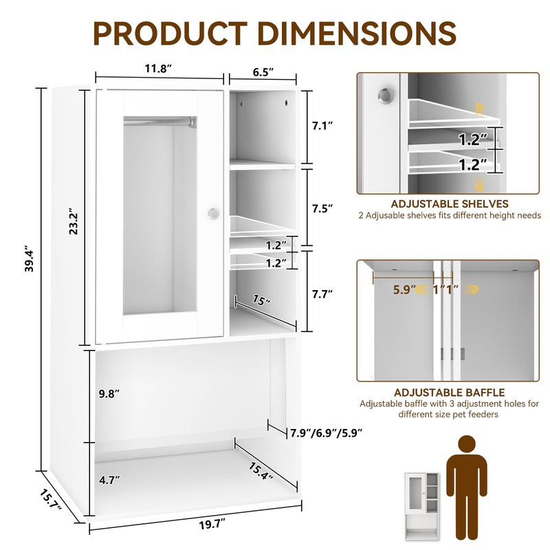 - All-in-One Pet Feeder Station: This multifunctional pet feeding station combines feeding and pet supply storage in one. Feeding area can compatible with most feeders, a hanging area with roads for pet clothes. Ajustable storage area that provides ample space for pet food, toys, and supplies.