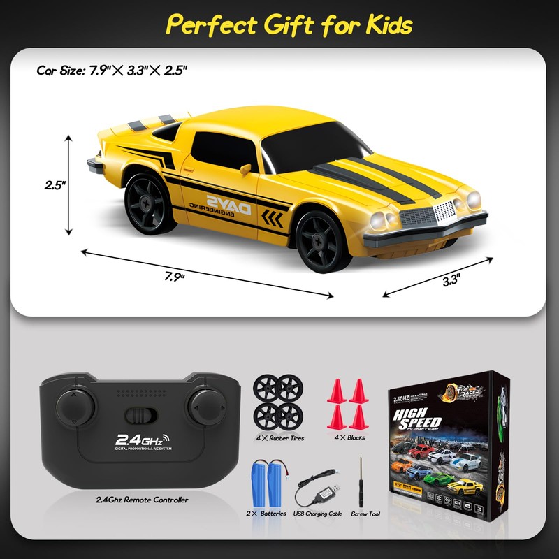 - Two Replaceable Tires: Our mini drift cars come with 4 speed racing tires and 4 drift tires. When you want to show off this high-speed rc drift car with stunts, you can drift on smooth boards, tiles, tracks with better handling and good agility, and when you want to make it a sports car, the racing tires will be your better choice. One toy car double fun